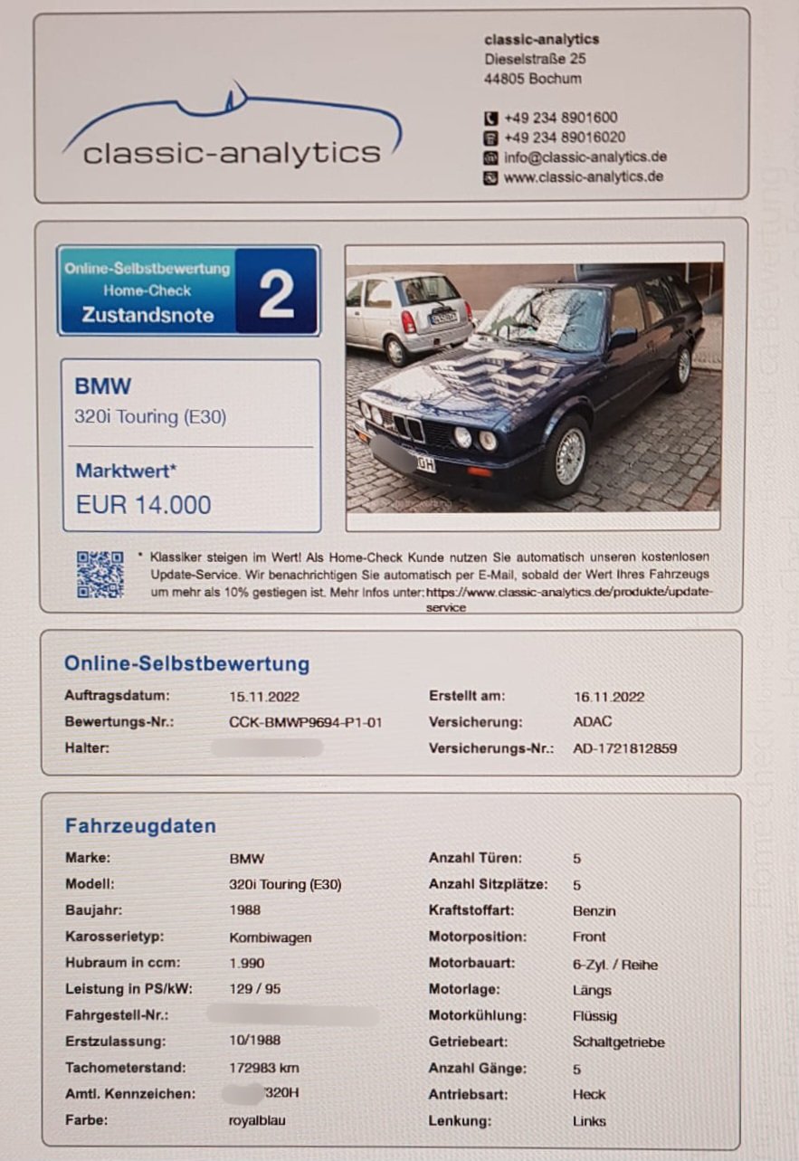 BMW E30 320i touring, royalblau, EZ10/88, 129 PS, H-Kennzeichen, original 185 TKM,