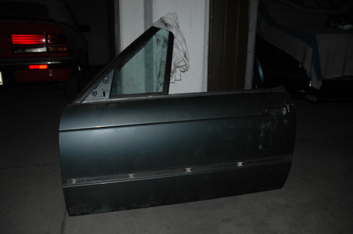 Hatte mal auf Verdacht und Vorrat eine Fahrertür MIT Scheiben fürs Cabrio, links, Fahrerseite, ohne Spiegel, in einem dunkelgrün oder delphingraumetallic (dachte ich) in die Garage gestellt und vergessen. Muss aufgrund der vielen Kratzer - nicht nur wegen meiner nicht sachgerechten Lagerung (einfach an die Wand gestellt) um den Türgriff außen noch bearbeitet werden. Ansonsten ist die Tür unfallfrei.