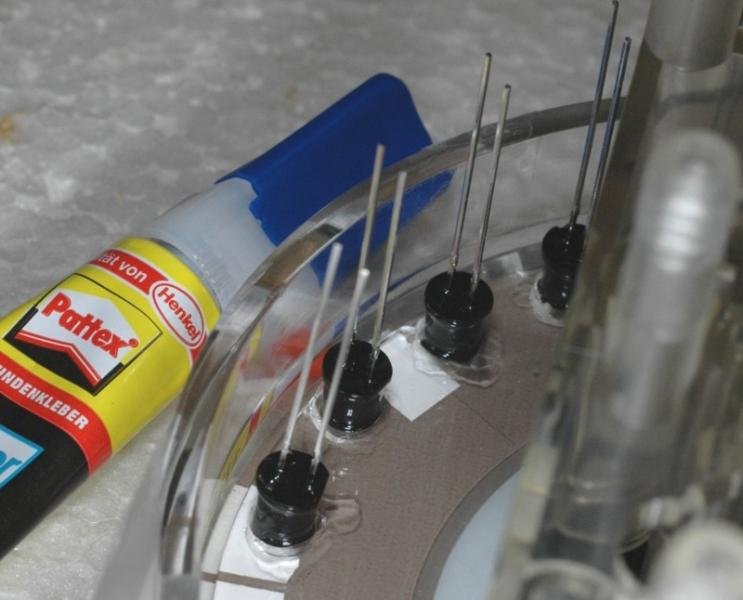 Die LED's werden mit Sekundenkleber in die Plexischeibe des DZM eingeklebt.