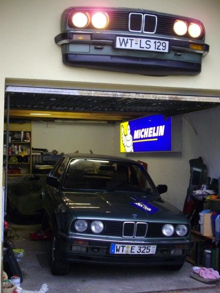 zwei mal Platanengrün: <br> <br>Die Hofbeleuchtung war ein unrettbar morscher 325e Bj 11/85 den ich einst nur wegen der Standheizung kaufte. Die "Hofbeleuchtung" entstand in dem ich die H1-Aufsätze von den Reflektoren abgemacht habe und statt