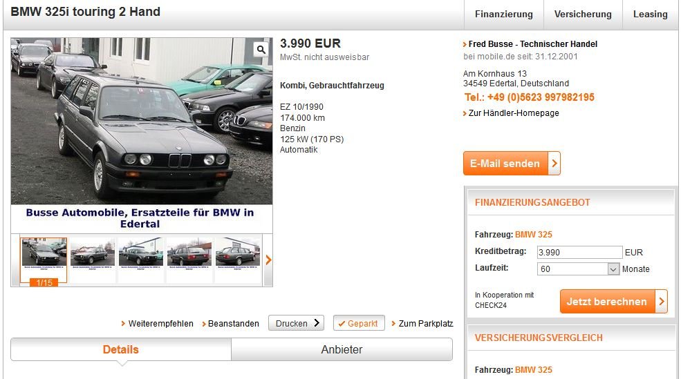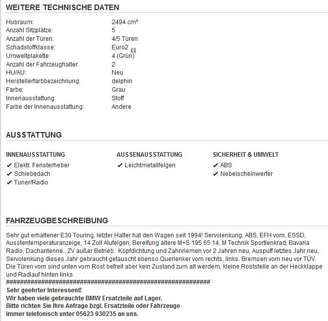 Der Verkäufer ist ein richtig seltsamer Mensch wenn es um seine Preisvorstellungen geht. Den grauen Touring hat er 2015 beim Busse (siehe etwas weiter oben, M5x Motoren Bild) gekauft. Inserat von damals, ich hatte einfach zu lang überlegt und nicht gekauft. Sogar das Püppchen aufm Armaturenbrett ist 10 Jahre später immer noch drin. Preis war beim neuen Eigner ab 2016 schon immer über 10k€. Für einmal von Edertal nach München fahren war das damals schon frech. Ich glaub auch kaum das der in 10 Jahren Standzeit irgendwas am KFZ gewartet hat.7 Mal gefällt mir