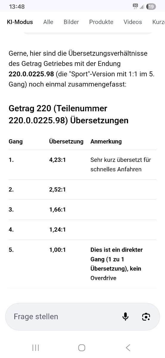 REXX Geschrieben: Samstag um 19:23 #96 Meldung Teilen Geschrieben: Samstag um 19:23 am Am 21.11.2025 um 13:49 schrieb Businesstouring: Das sagt zumindest die Google KI. Ich glaube das das ehrlich gesagt aber irgendwie nicht so recht. Denn dieser Getriebenummer ist wirklich häufig aufzufinden in diversen Motoren🤔 Das Getriebe scheint laut diesem Rechner gängig im E36 zu sein Quelle: E36-Talk https://share.google/EuylrmqsYhD5NaXOp Zitieren Link zu diesem Kommentar Auf anderen Seiten teilen Weitere Optionen zum teilen...
