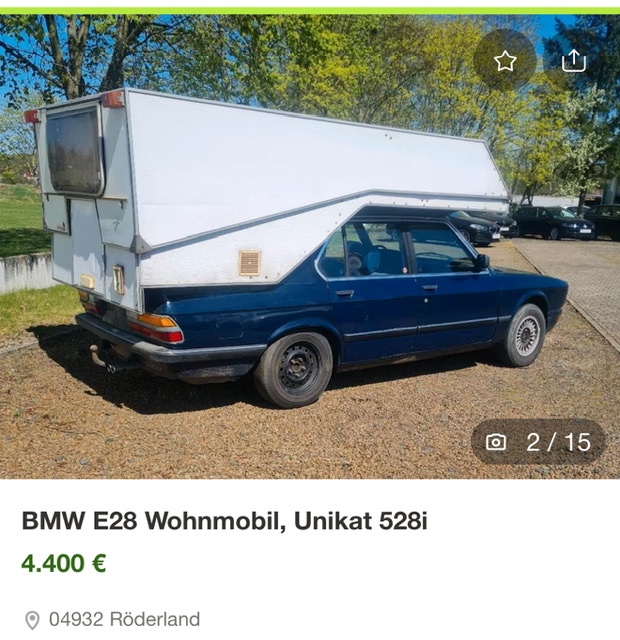 MartinE30 Geschrieben: Dienstag um 09:57 #8080 Meldung Teilen Geschrieben: Dienstag um 09:57 Irgendwie kam mir der WoMo Umbau bekannt vor - taucht wohl immer wieder mal in BMW Foren auf. Gegencheck mit tante google: Wenn man bei google "bmw e28 Wohnmobil" eingibt, findet man einige Bilder. Scheint wohl kein Einzelumbau gewesen zu sein, da gab es offenbar eine Handvoll mehr davon. Zitieren Link zu diesem Kommentar Auf anderen Seiten teilen Weitere Optionen zum teilen...