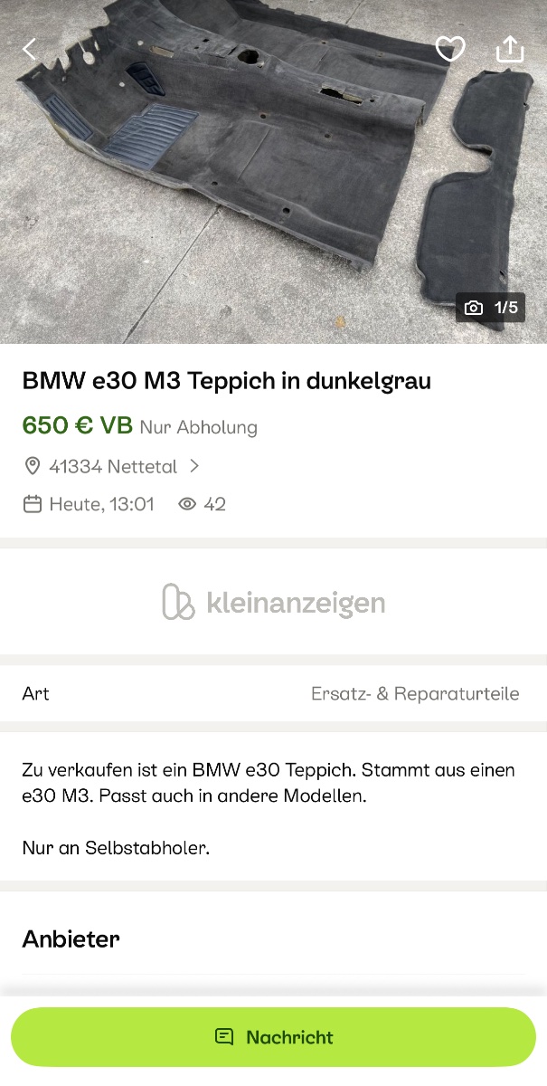 RS-Tuner Geschrieben: 21. September #52 Meldung Teilen Geschrieben: 21. September (bearbeitet) Für die die nen Teppich suchen. https://www.kleinanzeigen.de/s-anzeige/bmw-e30-m3-teppich-in-dunkelgrau/3194640024-223-1182?utm_source=whatsapp&utm_campaign=socialbuttons&utm_medium=social&utm_content=app_ios Bearbeitet: 24. September von RS-Tuner Zitieren Nicht quatschen. Machen! Link zu diesem Kommentar Auf anderen Seiten teilen Weitere Optionen zum teilen...