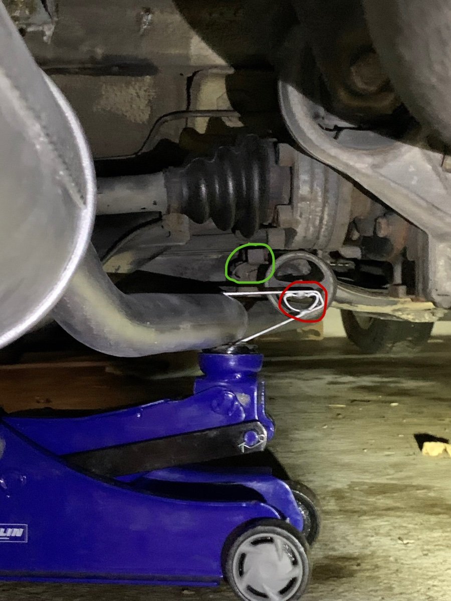 Was helfen könnte: Mit dem Halter am Getriebe etwas höher, soweit das ohne Gewalt geht. Dann den Topf in der hinteren Schelle auch höher drücken (Schelle lösen, Topf hochdrücken und z.B mit Wagenheber unterstützen, dann die Schelle wieder festziehen), eventuell auch den Halter am Achsträger etwas tiefer setzen (der hat ja ein Langloch zur Höhenverstellung).
