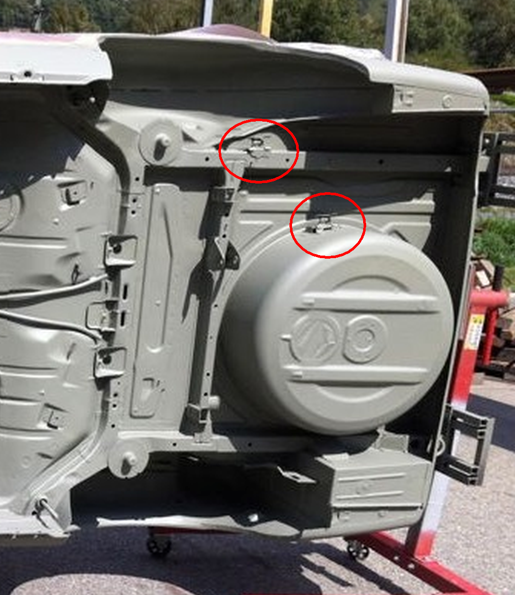 Ich habe mal ein Bild aus dem Netz gemopst, wo ich beide Halter für den M40- und M20-Topf eingekreist habe: Einer ist an einer Lasche an der Reserveradmulde angeschweißt, der zweite  am Längsträger: