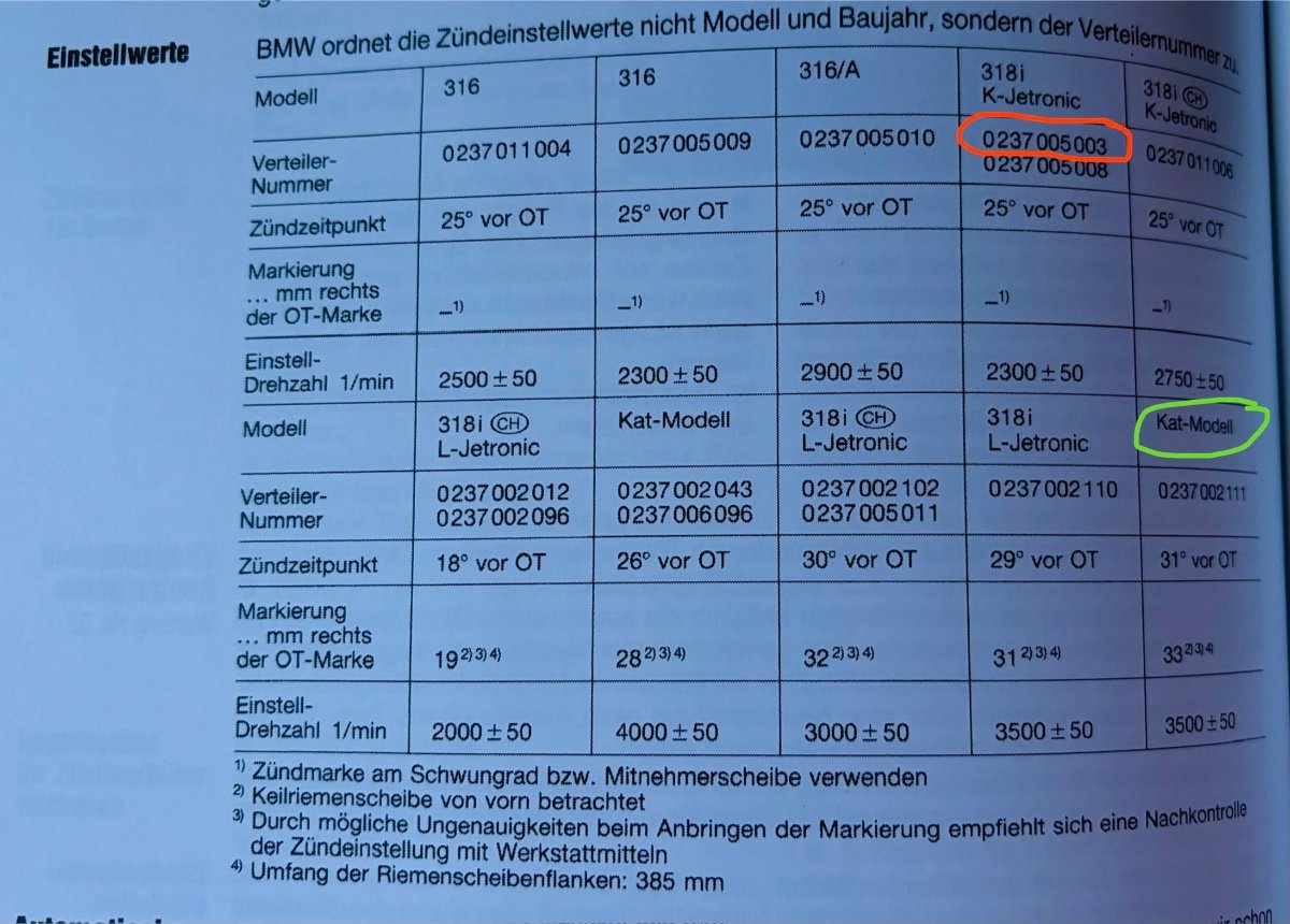 dennis.k Geschrieben: vor 3 Stunden #1 Meldung Teilen Geschrieben: vor 3 Stunden Hello zusammen, eine kurze Frage zum Zündung einstellen, da es mich etwas verwirrt. Wie das ganze geht ist nicht das Problem, aber die Richtlinien. Soweit ich weiß soll man das ganze nach der Nummer auf dem Verteiler machen, aber das ganze sollte doch auch irgendwie zum Motor/Auto passen oder nicht? Mein 316i mit 318i Motor ist hier zwar nicht vertreten aber vom logischen her und von den Daten her, sollte es der grün markierte sein. Nun habe ich an meinem Wagen aber scheinbar einen Verteiler von einer K-Jetronic (rot markiert) denn mein Verteiler Ended auf 003. Ist nun das Bild oben falsch, mein Verteiler der Falsche, evtl. Sogar beides oder wird es auf dem Bild nur missverständlich dargestellt? Das ganze ist im Moment nur nach Gehör eingestellt, aber würde es auch gerne richtig einstellen und endlich mal wieder die Lichtpistole nutzen Zitieren Link zu diesem Kommentar https://e30-talk.com/topic/211874-z%C3%BCndung-einstellen-316i-m10b18/ Auf anderen Seiten teilen Weitere Optionen zum teilen...